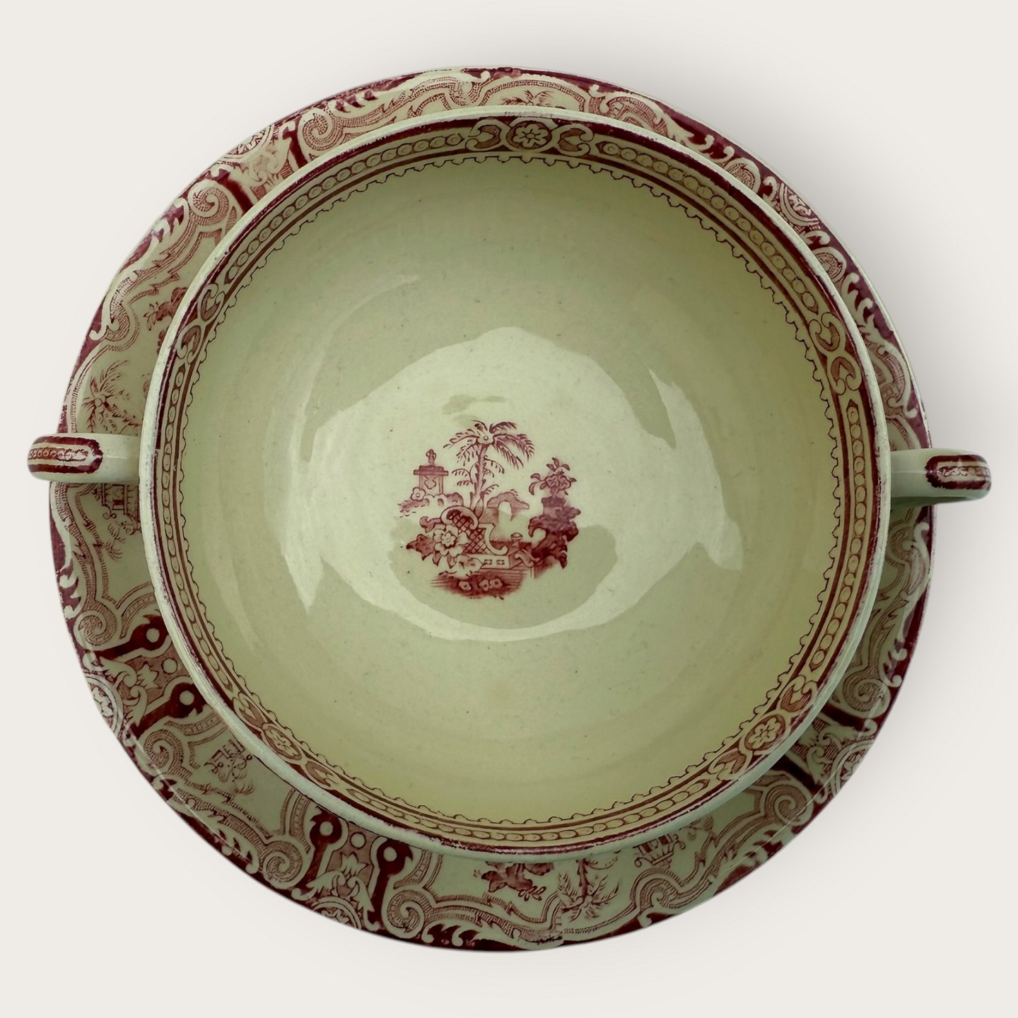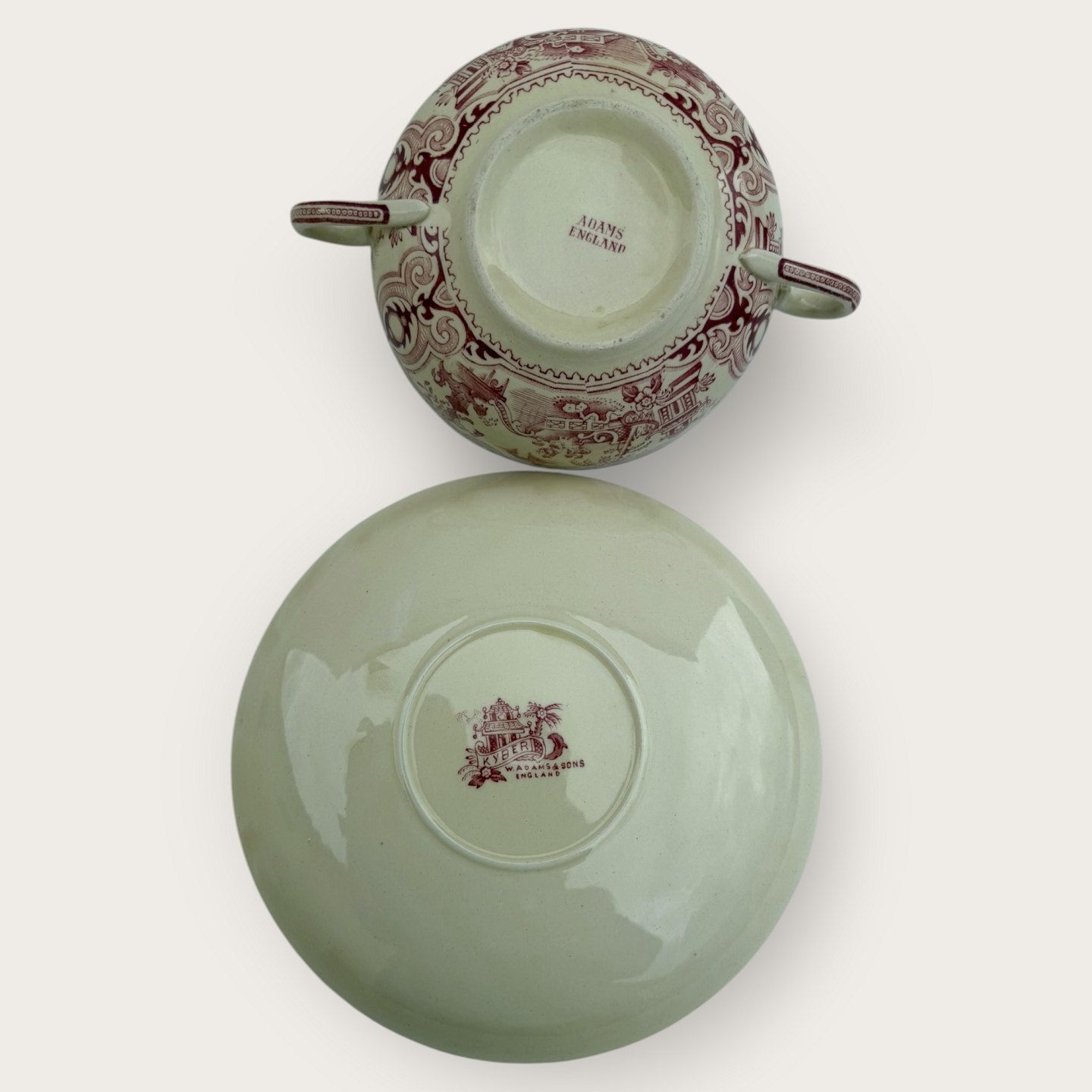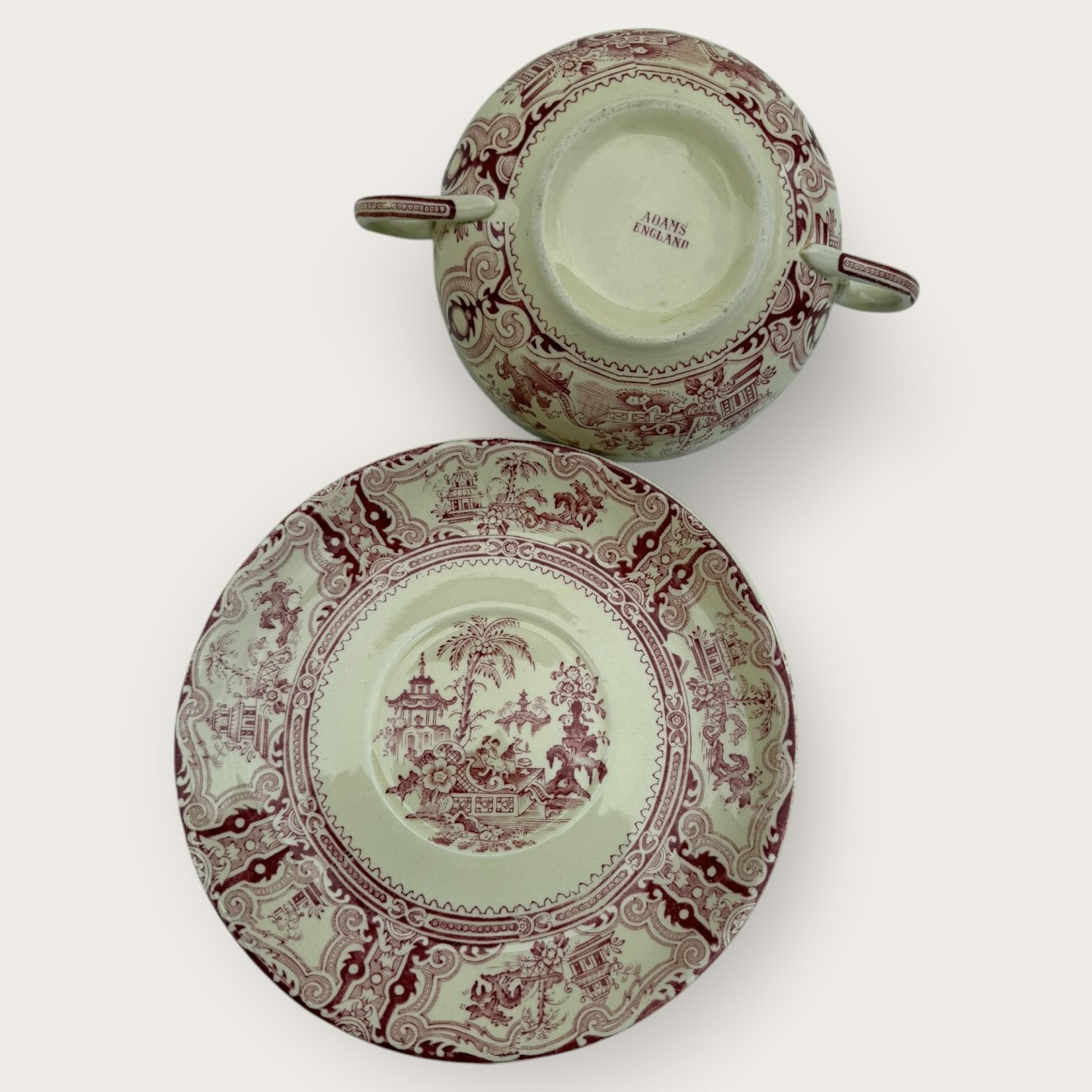William Adams, Kyber mit rotem Chinesenmotiv, Bouillontasse, Tassendurchmesser 12cm, Untertasse 17cm, guter gebrauchter Zustand.