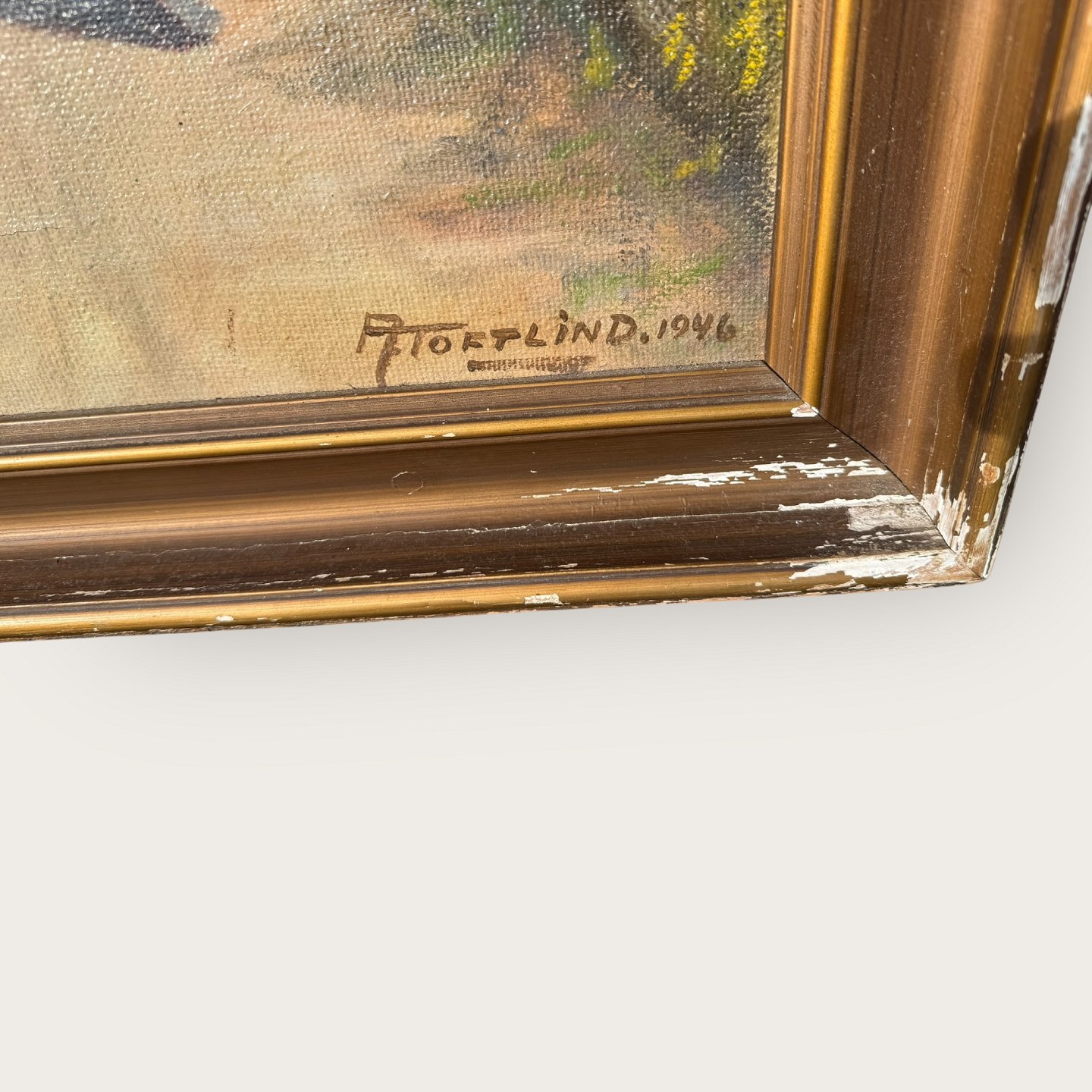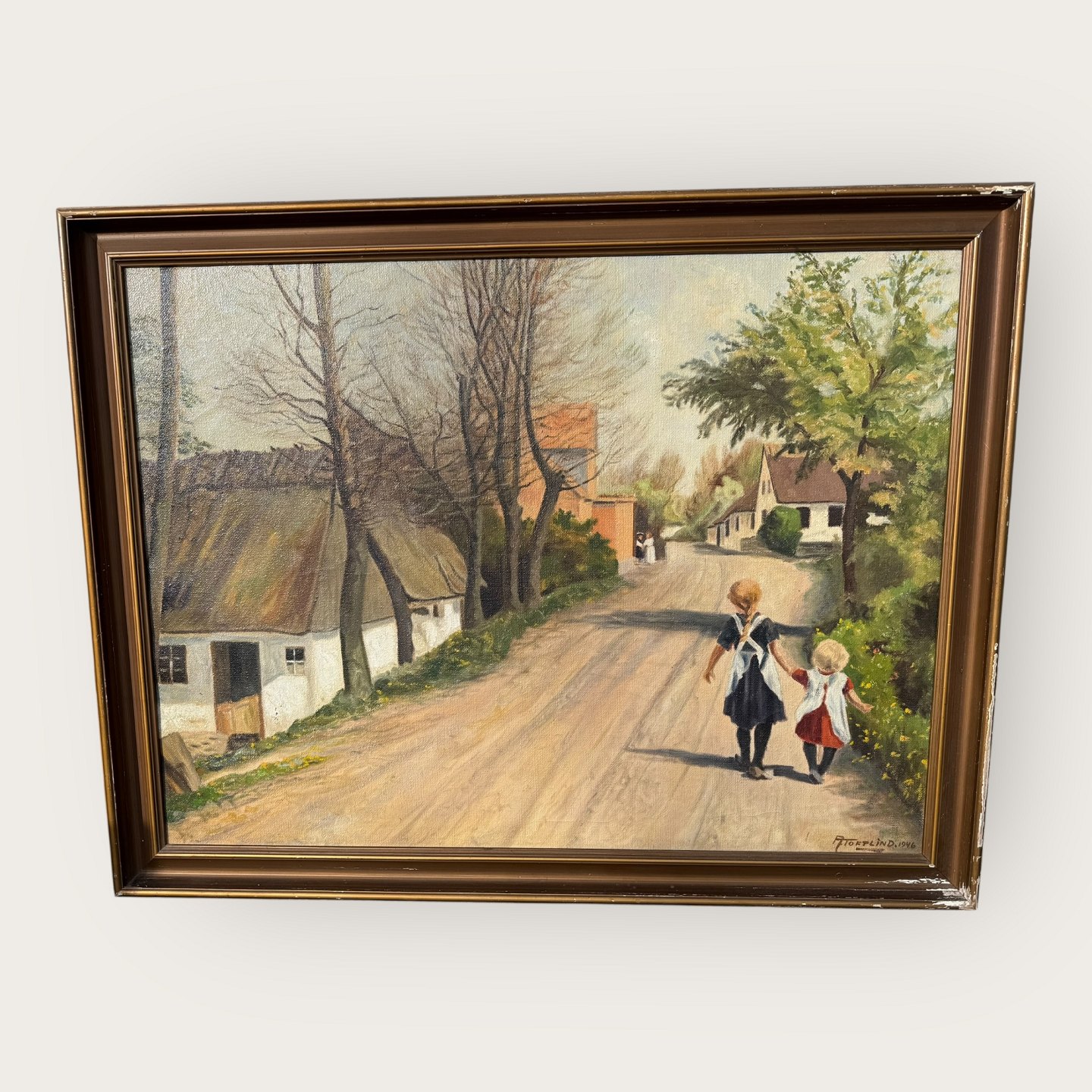 A. Toftlind, Mädchen auf einer Straße, Öl auf Leinwand, der Rahmen weist leichte Abplatzungen auf, ansonsten guter Zustand, Maße mit Rahmen: 110 x 85 cm