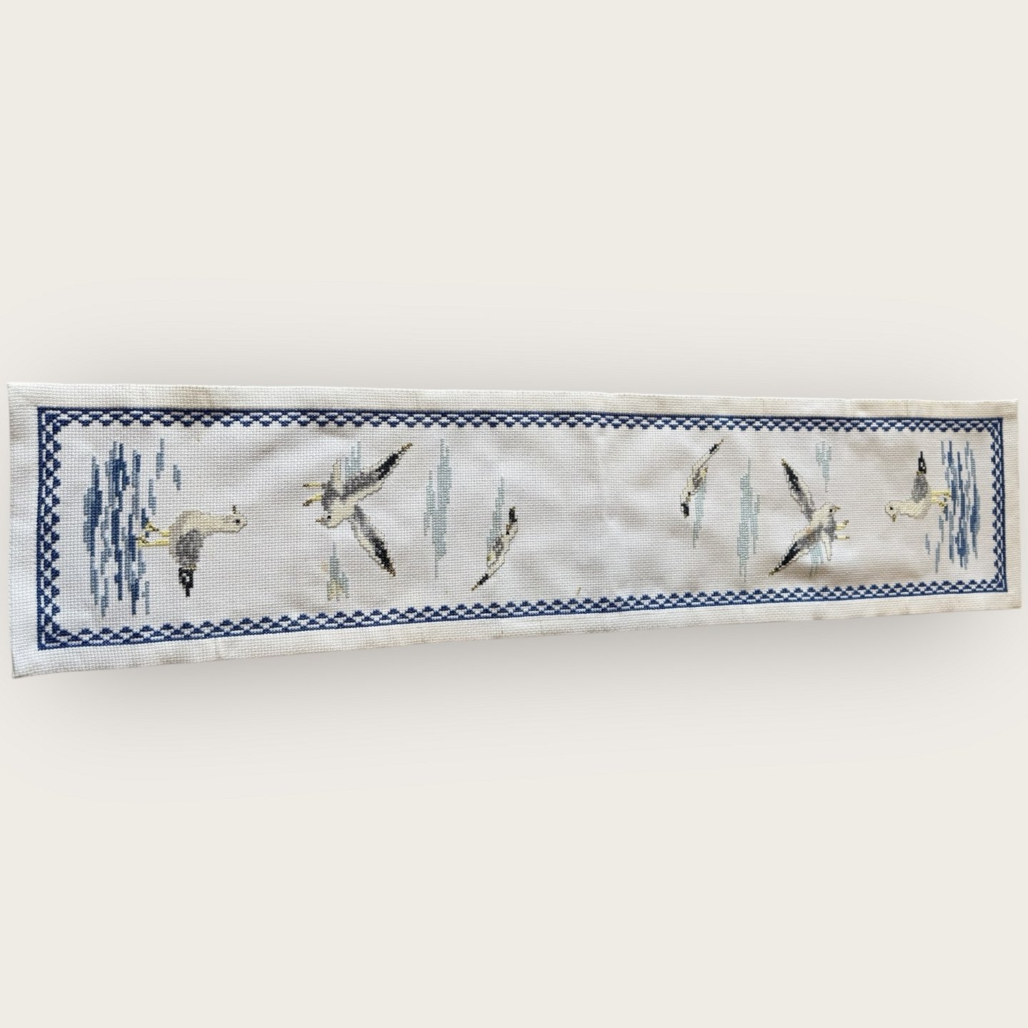 Håndsyet bordløber med mågemotiv, 90x20cm *fin stand*