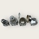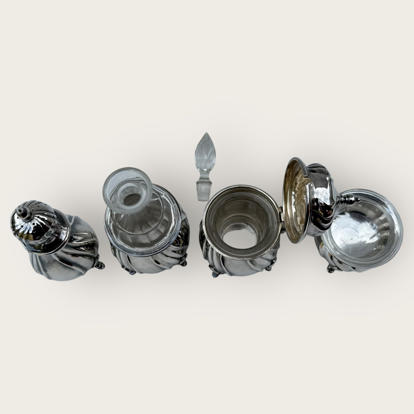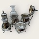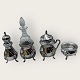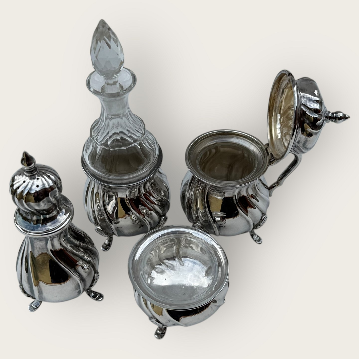 Cohr sølvvarefabrik, Plat de Menage, 4 dele, saltkar med glasindsats, sennepskrukke også med fin glasindsats og flaske / karaffel i fin stand (højde 15,5cm), Saltkar diameter 6cm, sennepskrukke 11cm høj, Peberbøsse 12cm høj