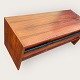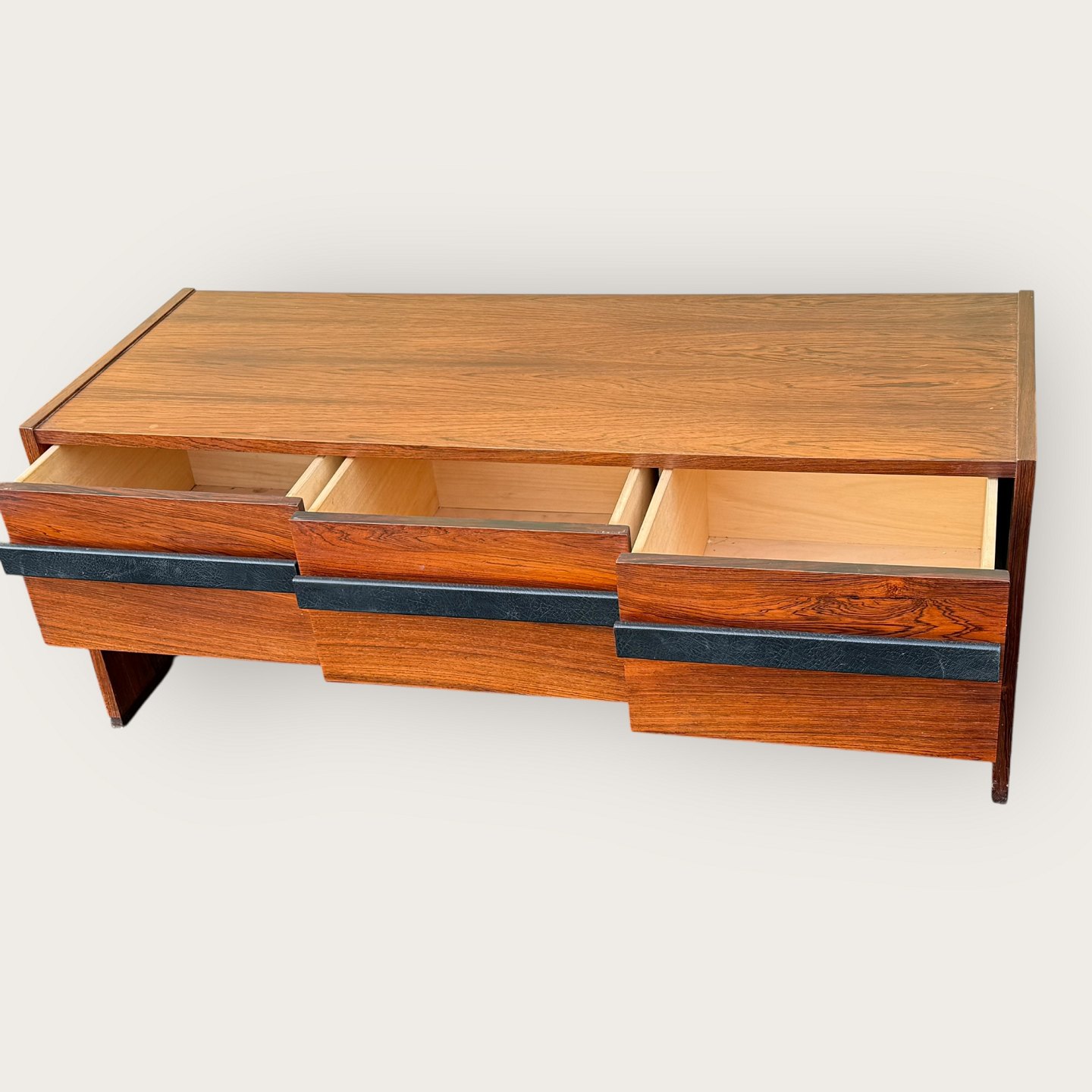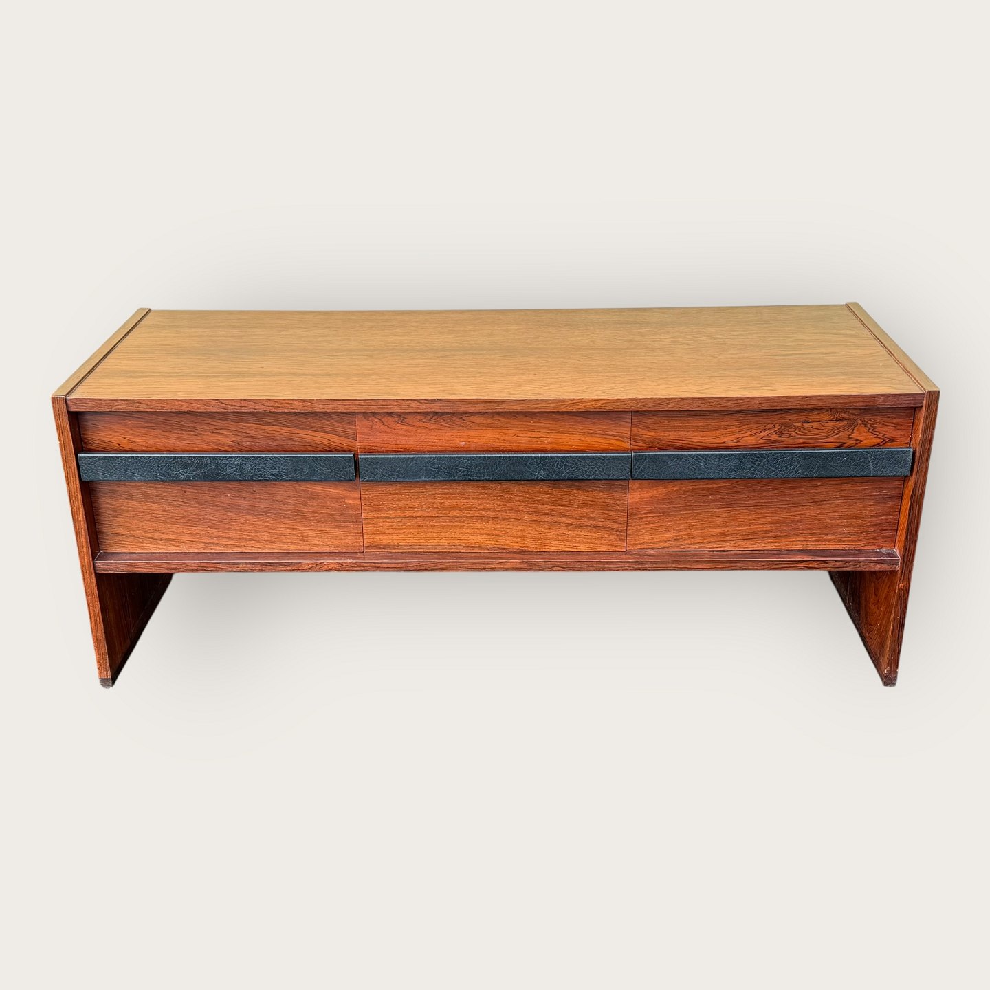 Lav skænk i palisander finer, tre skuffer med læderbetrukne håndtag, Udgået og mærket fra Illums Bolighus, Mål: HxBxD 46x116x45cm, har været stort entresæt i kombination med Palisanderspejlet varnr. 632831 *Fremstår i pæn brugt stand med få brugsspor*