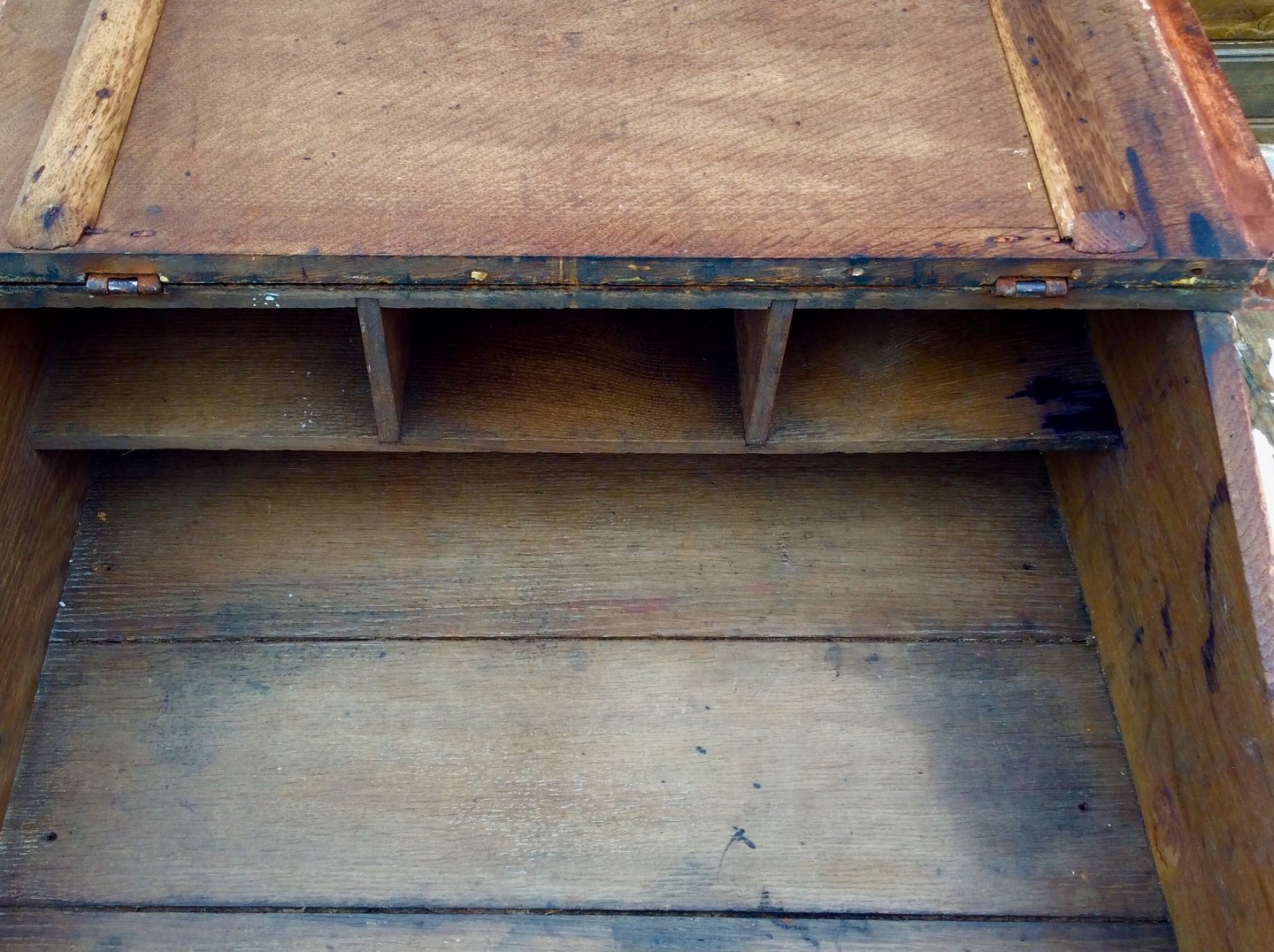 Ældre Skrivepult i Eg, 60cm bred, 60cm dyb, 22cm høj *Aldersrelateret brugsspor*