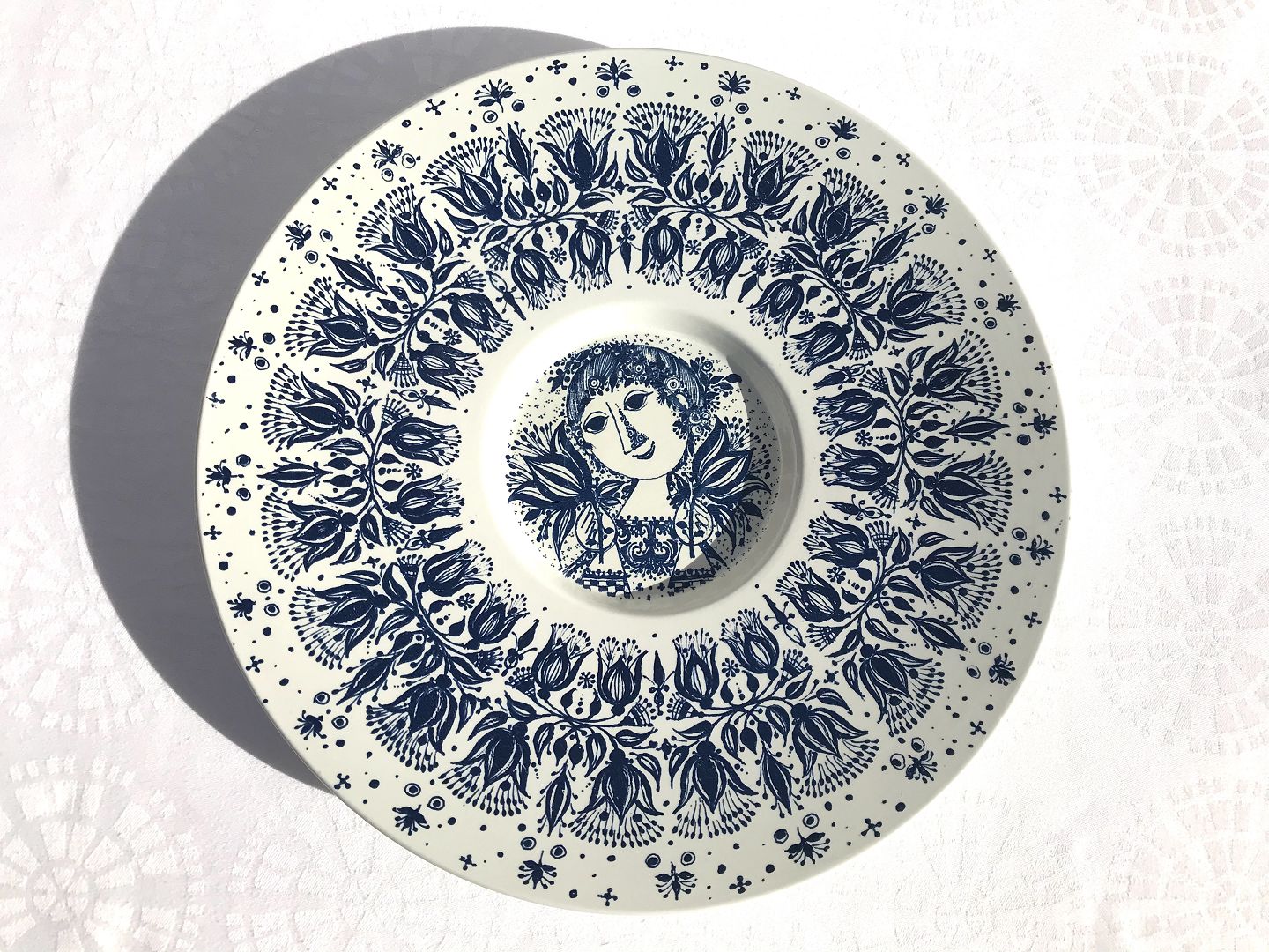 Bjørn Wiinblad, Nymølle, Blå Platte med kvindeansigt, 30cm i diameter, Nr. 3057/1242 *Perfekt stand*