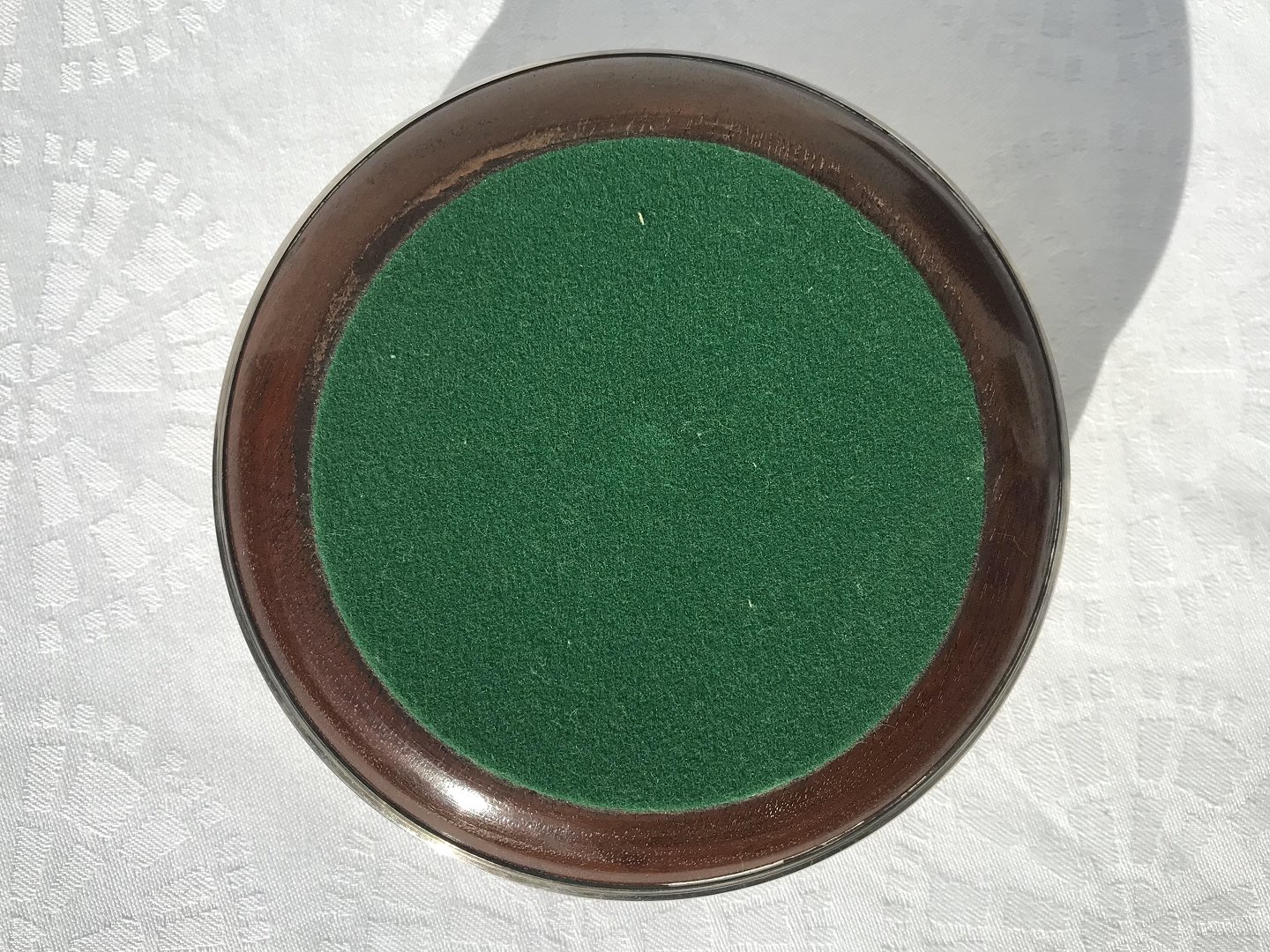 Flaskebakke, Sølvplet med træ bund, 12,5cm i diameter, 4cm høj *Perfekt stand*