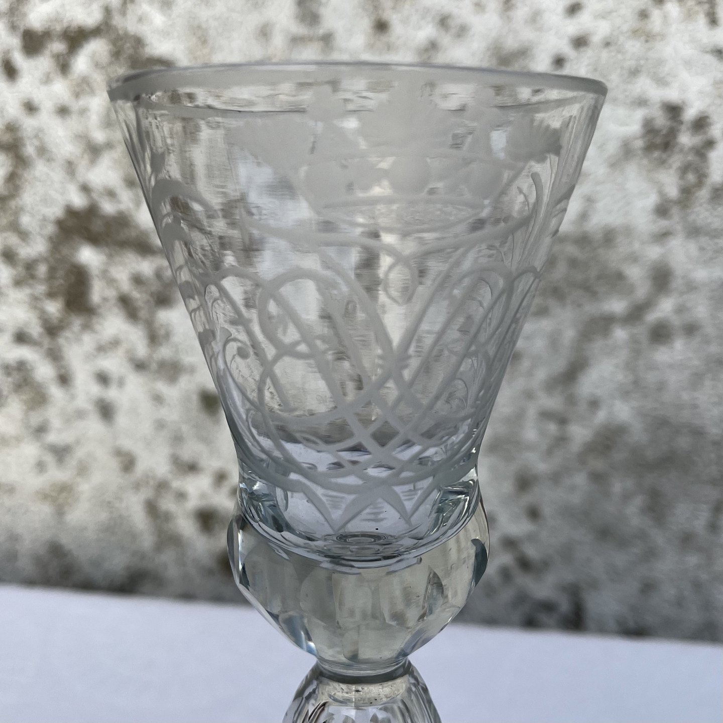 Ældre vin glas i krystal med slebet monogram og kongekrone, Fra midten af 1800'tallet. 17cm høj, 6,8cm i diameter *Pæn stand*