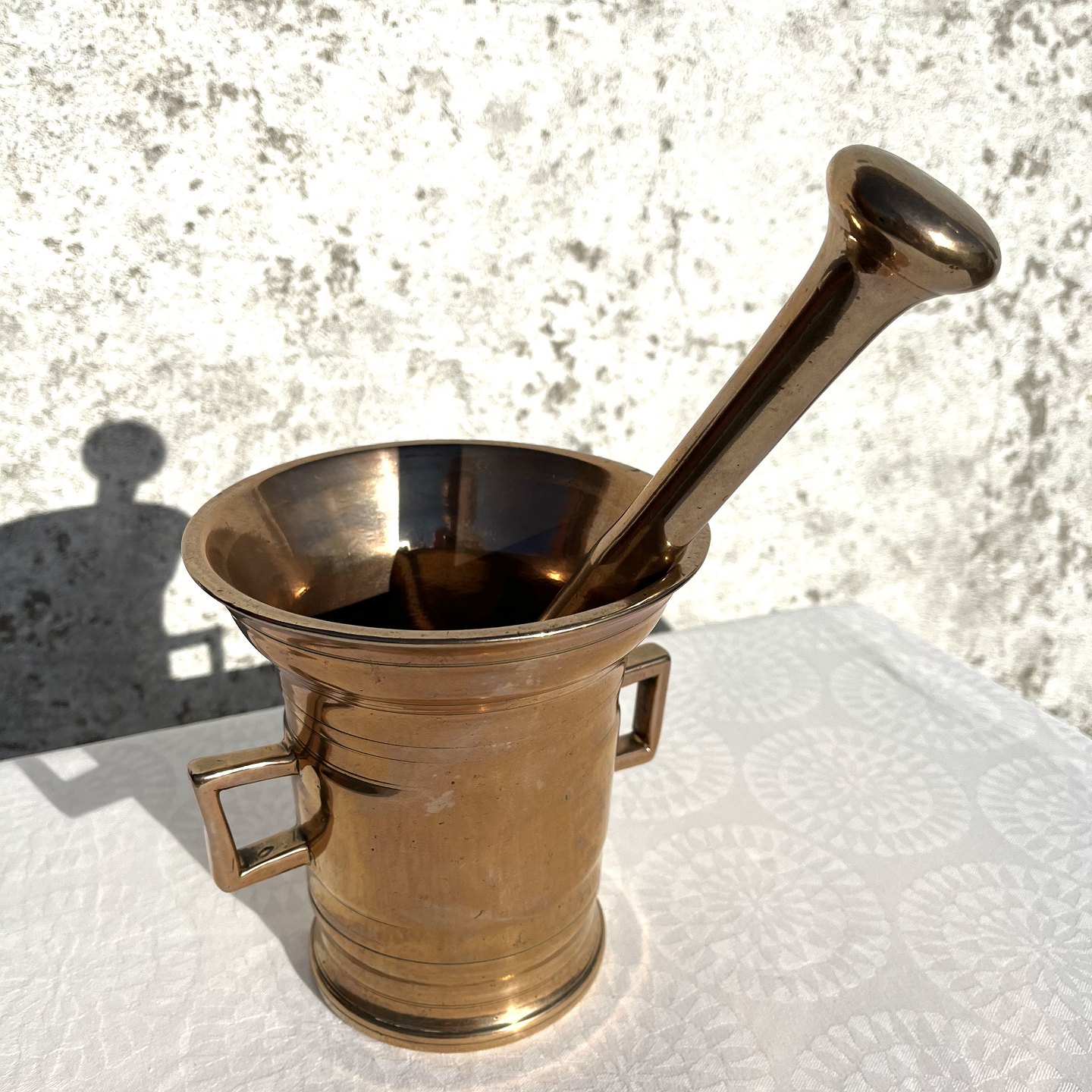 Tung messing morter med pistel 15cm diameter, 15cm høj, Pistil længde 26,5 cm, samlet vægt 4,8 kilo *Med en kraftig sprække langs bunden (se foto) ellers fin patineret*