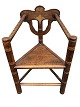 Ældre svensk munkestol med rige udskæringer i karvesnit. Sædehøjde 44 cm. Medfølgende broderede puder med kraftig slitage.