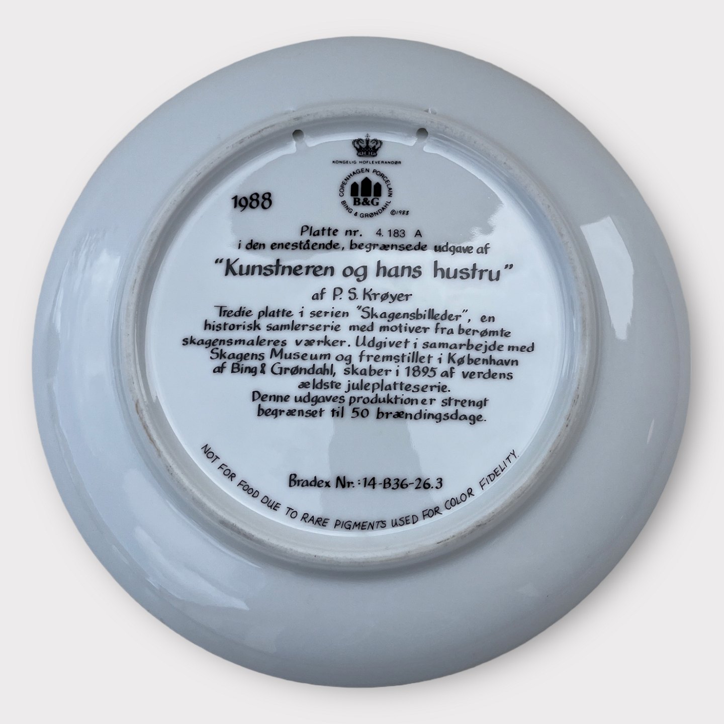 Bing & Grøndahl, Skagensmalerne, 1988, Platte nr. 4, "Kunstneren og hans hustru", P.S. Krøyer *Perfekt stand*