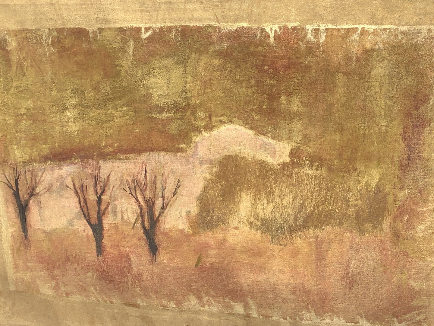 Alicia Ibarra (1961- ), Olimaleri på lærred, "Tres Arboles Secos", På bagsiden påskrevet: Propiedad Galeria, Barcelona 1991. Mål med ramme 120x85cm