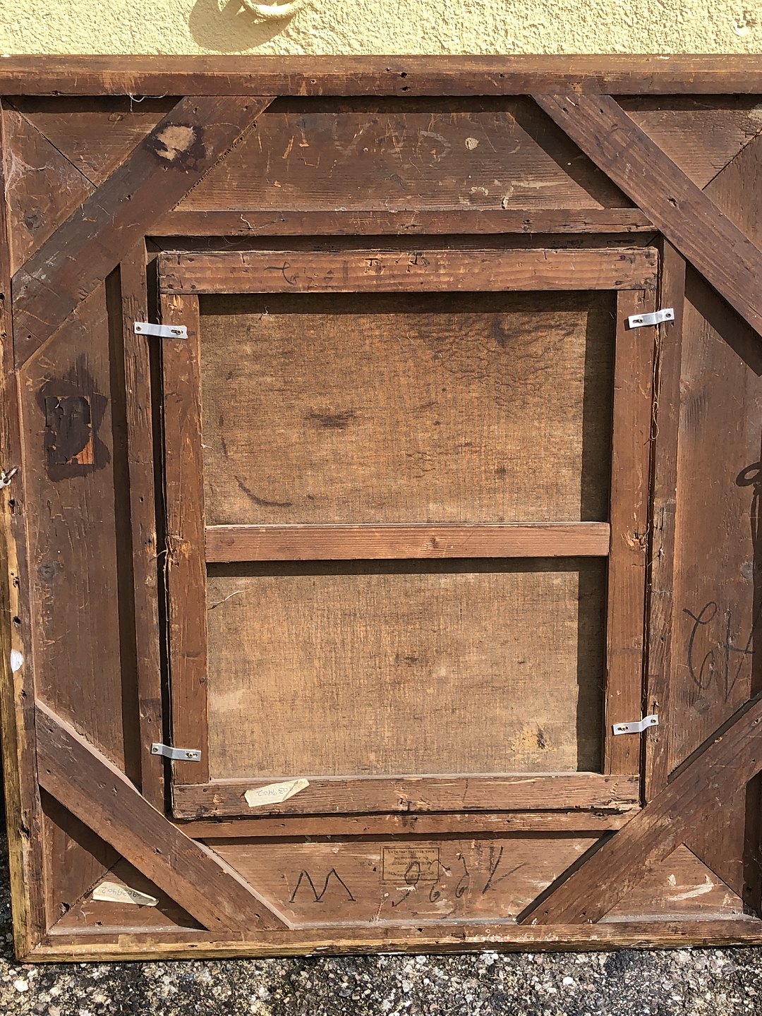 Ældre midteuropæisk landskabsmaleri med fårehyrde. På bagsiden mærket fra indramningen på: Rue d'Amsterdam 100, Paris. Fremstår med kraftige afslag på rammen og med krakeleringer/aldersrelaterede spor på maleriet. Mål med ramme: 90x80 cm