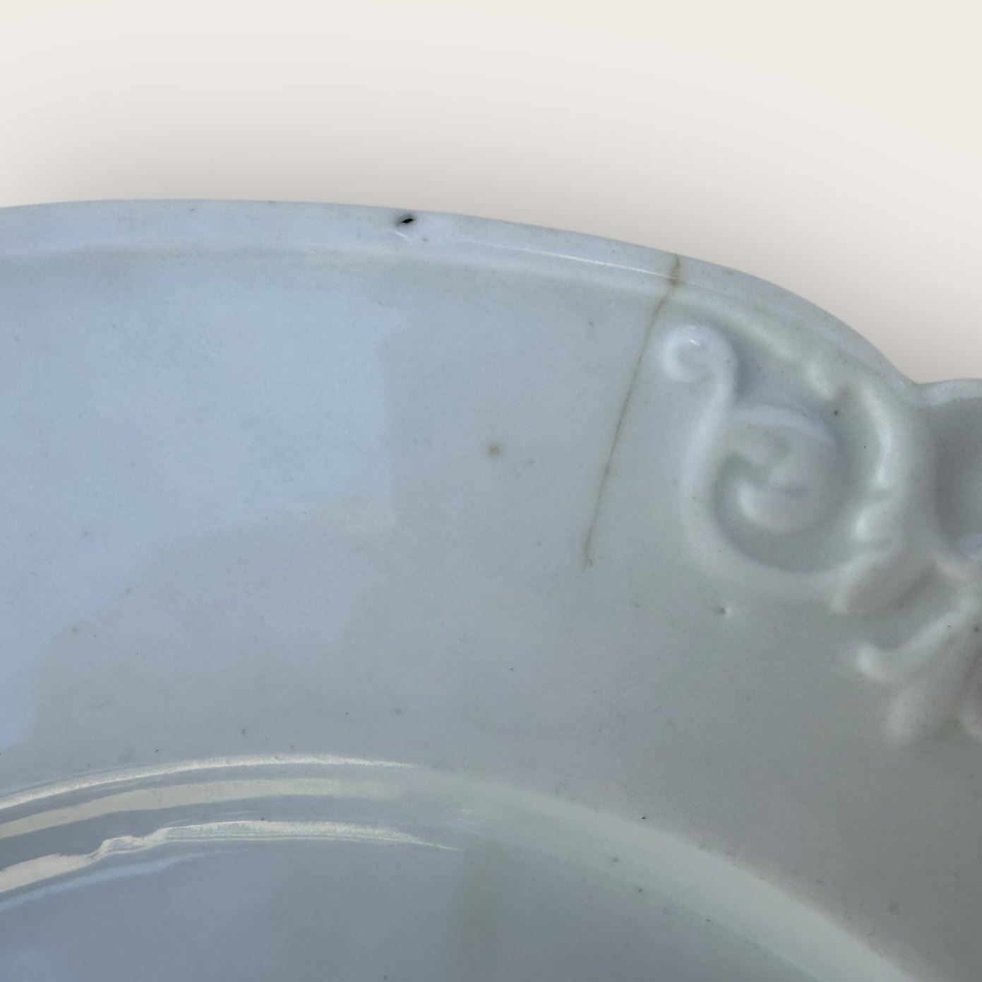 Royal Copenhagen, Rokoko hvid, flad tallerken, 26 cm i diameter, har en lille hårrevne ( se foto)