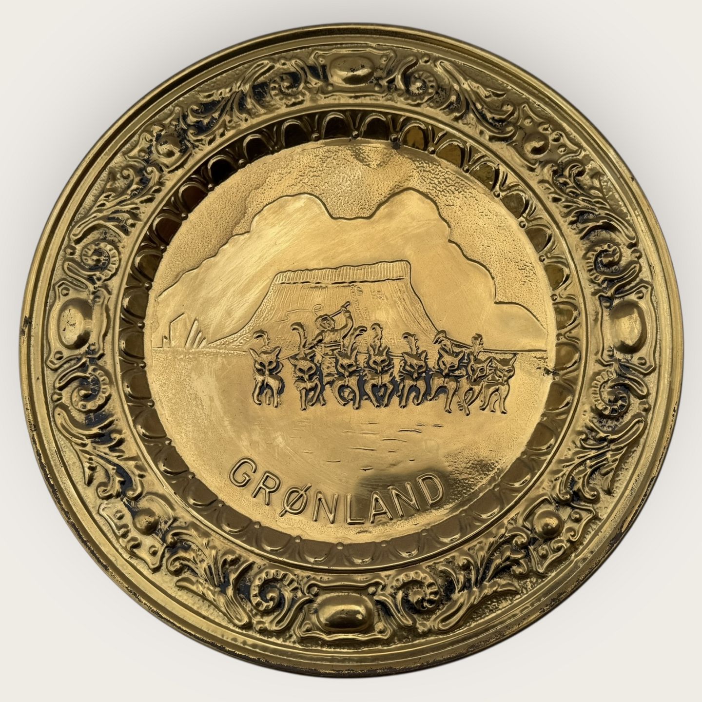 Messing fad, Hundeslæde på Grønland, diameter 43cm, Pæn patineret stand.
