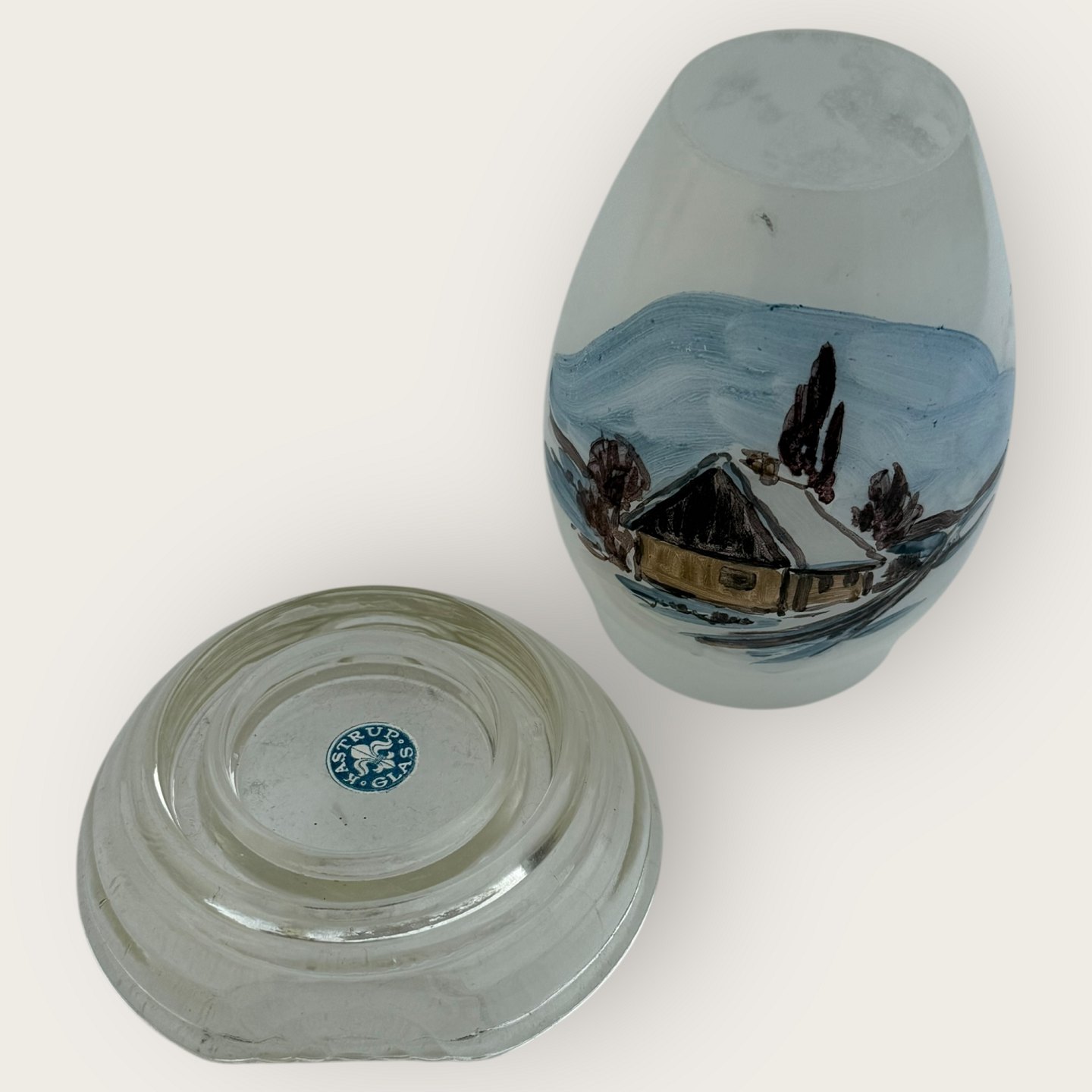 Kastrup Glasværk, hyggelampe med håndmalet dekoration til fyrfadslys, ca. 9cm høj *Et par mørke pletter i det øverste glas ellers fin stand *