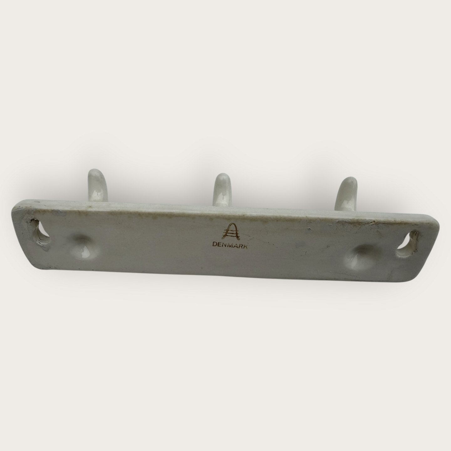 Aluminia, knagerække, 18x16cm, 3 knager * Med lidt patinering ved skruehuller og små krakeleringer under glasuren (se foto)