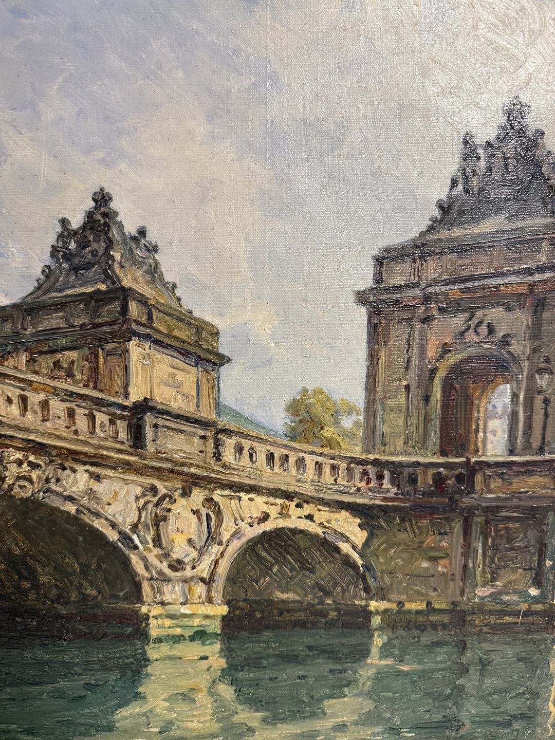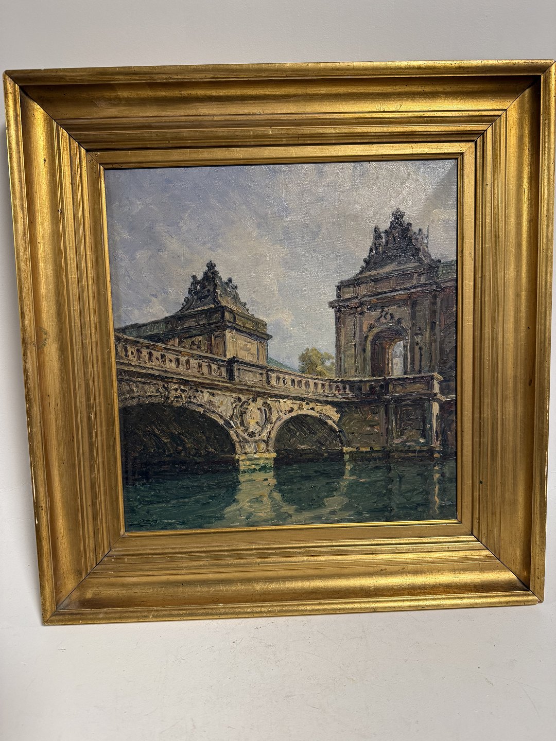 Peter Elias Petersen (1859-1950), Marmorbroen ved Christiansborg i København med godt lys over bro og vand, Signeret P.E.P. og bag på påskrevet P. E. Peteresen 1922, Mål med ramme: 46,5x44,5cm *Fin stand*
