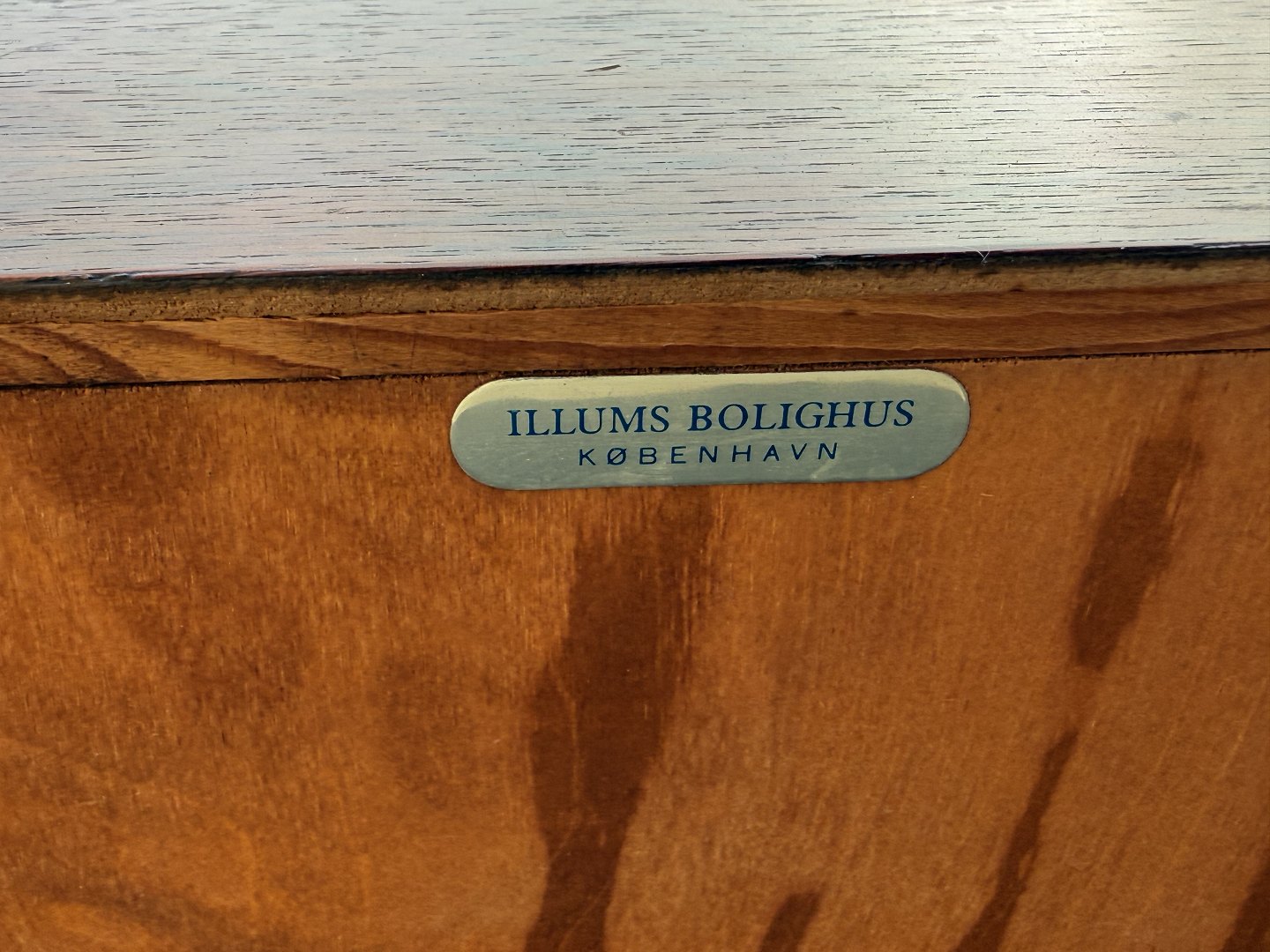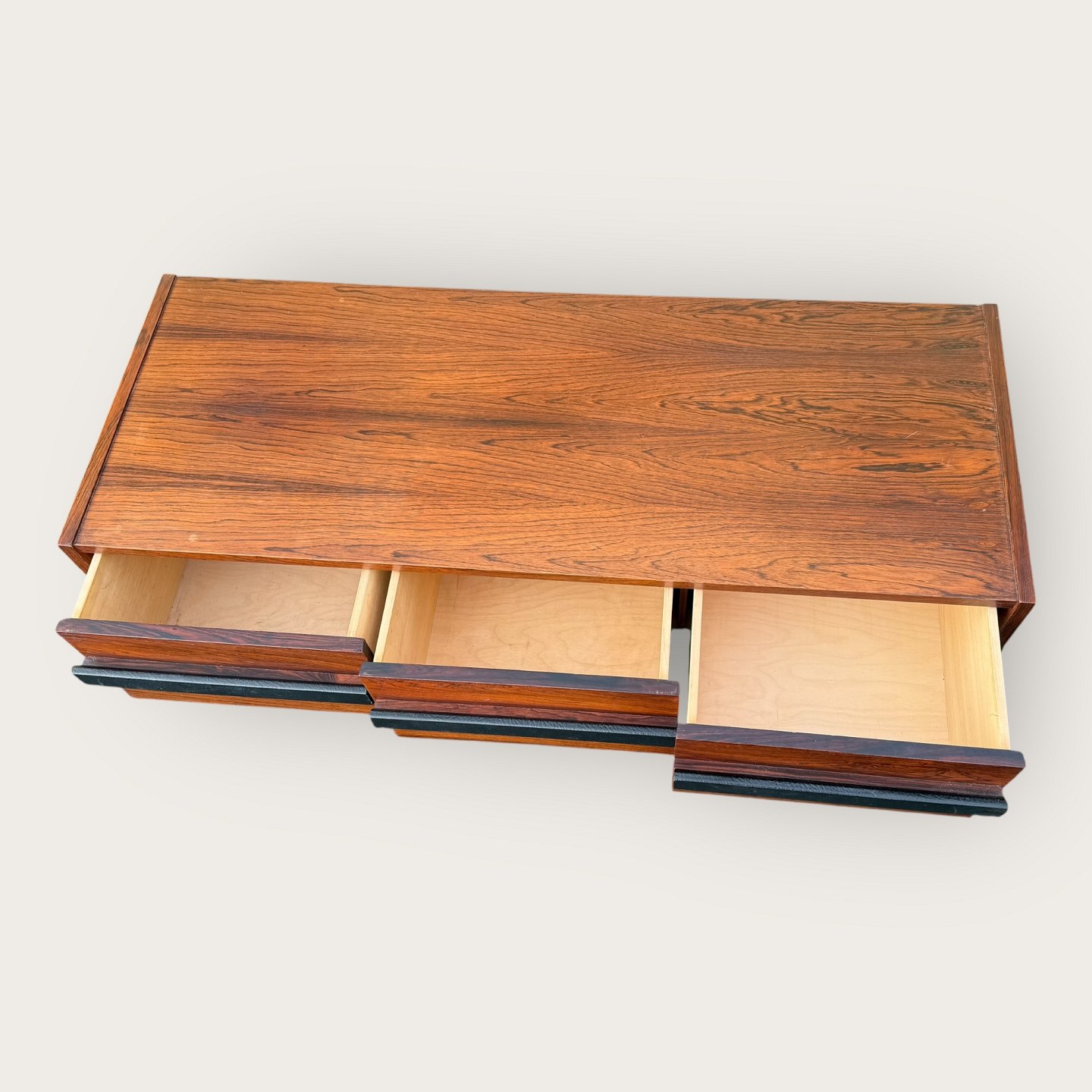 Lav skænk i palisander finer, tre skuffer med læderbetrukne håndtag, Udgået og mærket fra Illums Bolighus, Mål: HxBxD 46x116x45cm, har været stort entresæt i kombination med Palisanderspejlet varnr. 632831 *Fremstår i pæn brugt stand med få brugsspor*