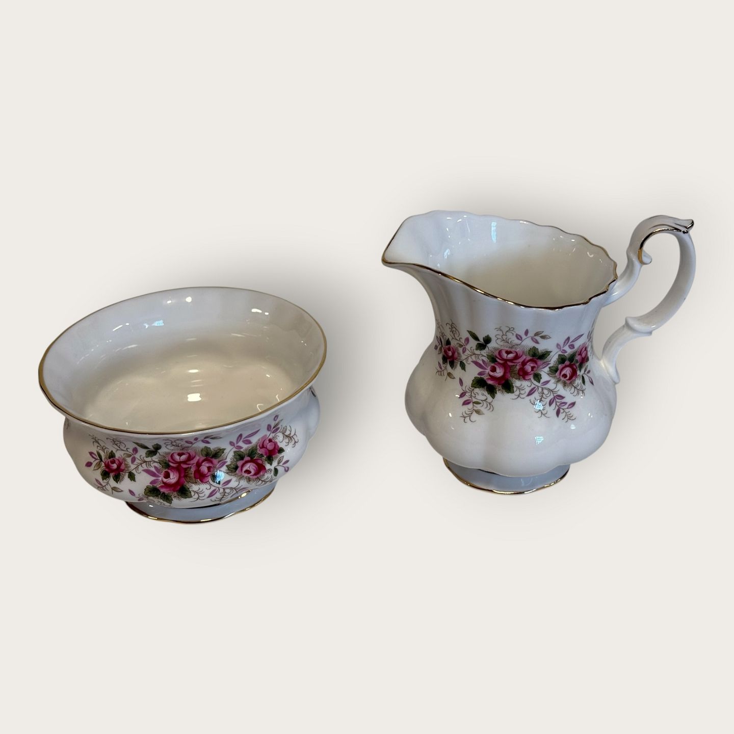 Royal Albert, Bone China, Lavender Rose, Stort Sukker og flødesæt, sukkerskål højde 6cm, diameter 11cm, flødekande ca. hxbxl 10,5x12x8,5cm *Perfekt stand*