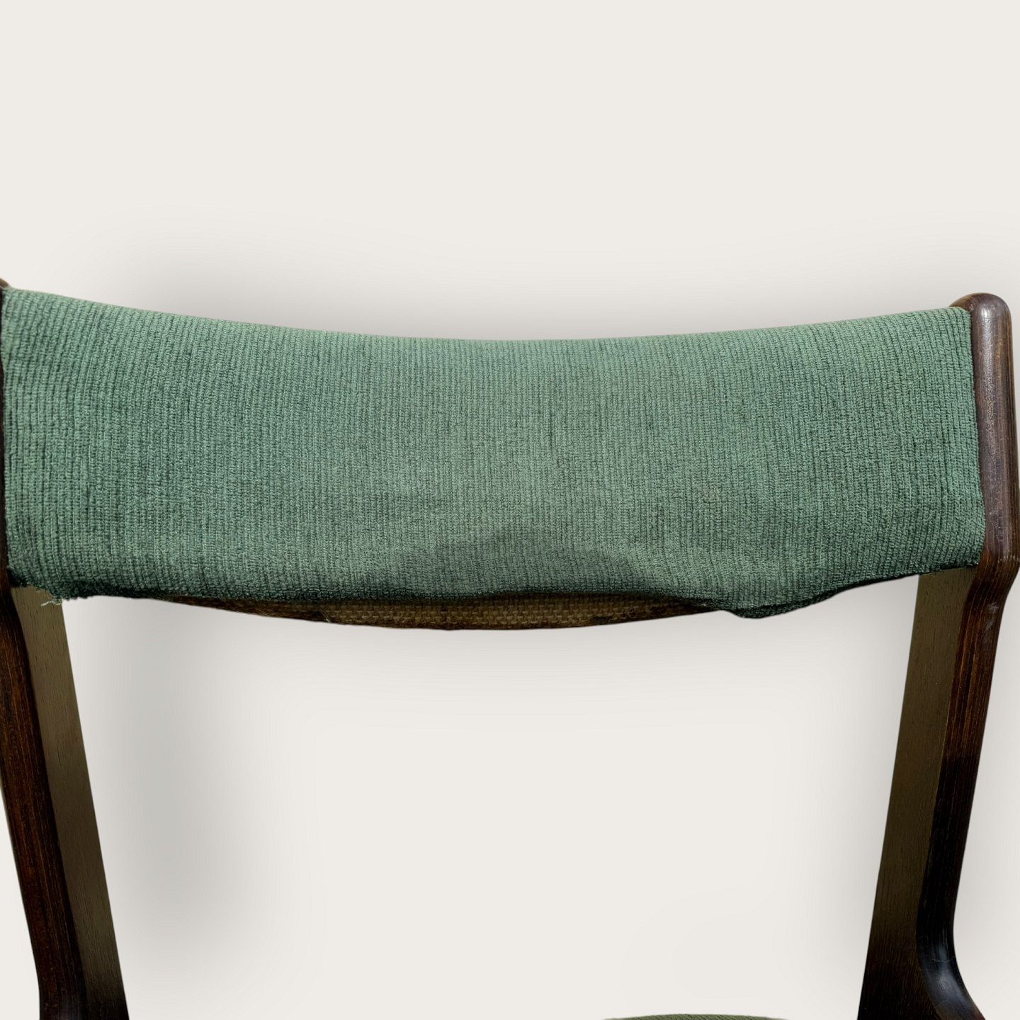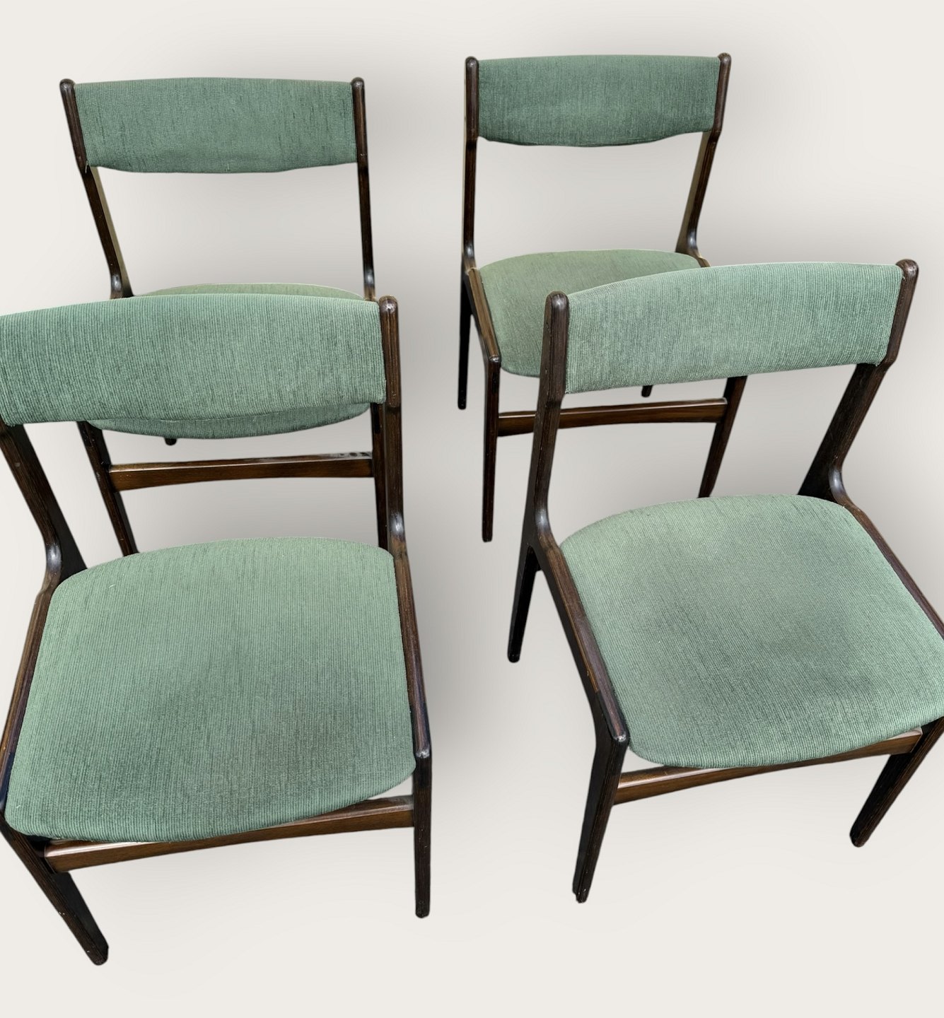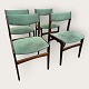 4 stole i mørkt bejdset træ, danish modern fra 1960'erne, stolene er stabile og i pæn brugt stand, men betrækket er plettet / løst.